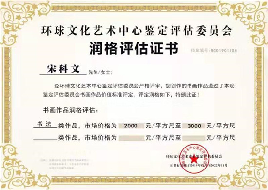 宋科文获北京宣和书画艺术研究院书法润格证书