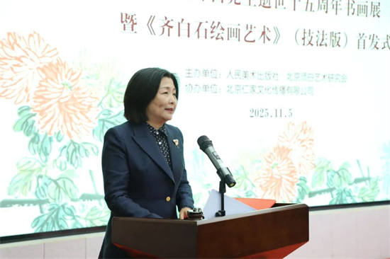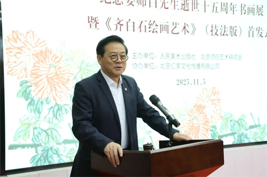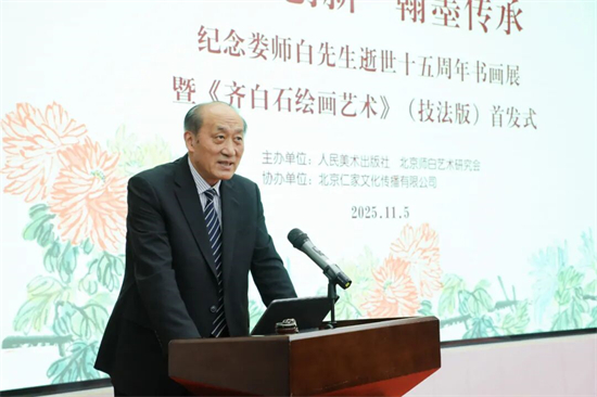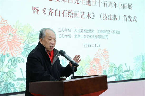 徐里表示:今天,我们怀着崇敬的心情,共同见证由人民美术出版社与北京师白艺术研究会联合主办的“守正创新·翰墨传承”主题活动启幕。这既是对娄师白先生逝世十五周年的深切缅怀,也是对齐派艺术薪火相传的郑重礼赞,更标志着承载着艺术传承使命的《齐白石绘画艺术》(技法版)正式与大家见面。
